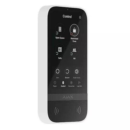 Ajax KeyPad TouchScreen belaidė valdymo klaviatūra skirta Ajax apsaugos sistemai valdyti – įjungti, išjunti apsaugą, aktyvinti tam tikras zonas. Saugus ir patogus naudojimas – apsauga įsijungia palietus vos vieną mygtuką arba suvedus kodą. Taip pat palaikomi atstuminiai praėjimo pakabukai RFID ir atstuminės praėjimo kortelės.