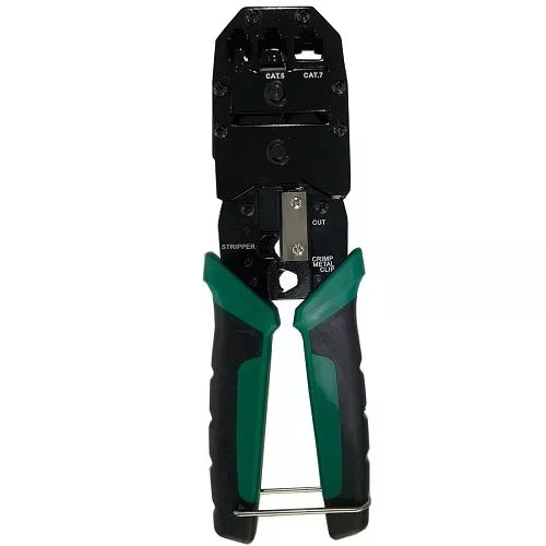 Specifikacija: Paskirtis: STP/UTP duomenų kabeliai CAT5, CAT5E, CAT6, CAT7, CAT8; 6 ir 8 pozicijų modulinės jungtys (RJ11, RJ12, RJ45). Funkcijos: kabelių izoliacijos nuėmimas, kabelių nukirpimas, 8P/6P kontaktų prispaudimas, atlaisvinimo / fiksavimo kilpa. Užspaudimo (krimpavimo) lizdai: CAT7/8 (RJ45), CAT5/5E/6 (RJ45), 6P (RJ11/ RJ12). Medžiaga: anglies plienas PP, šalto valcavimo plienas, SK5 anglinio plieno ašmenys. Ilgis: 210 mm. Svoris: 386 g. Spalva: juoda, žalia.