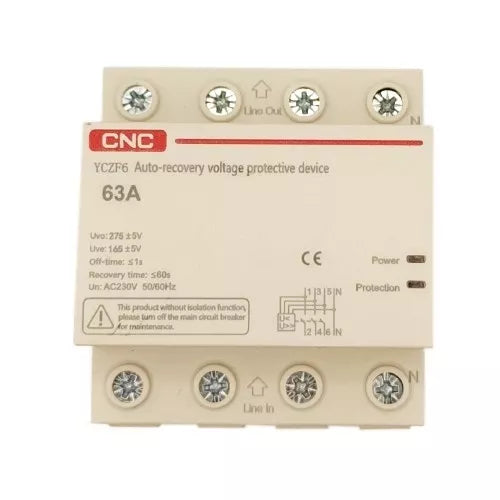 Ypatybės: Įtampos automatinis saugiklis su atsistatymo funkcija naudojamas elektros įrangos apsaugai nuo viršįtampių ar žemų įtampų. Automatinė apsauga nuo įtampos svyravimų tinka kintamosios srovės 230V grandinėms, kurių vardinė darbinė srovė ne didesnė kaip 63A. Kai grandinėje atsiranda viršįtampių ar žemų įtampų problemų, relė greitai ir patikimai atjungia grandinę, o kai grandinės įtampa grįžta į normalią būseną, automatiškai įjungia maitinimą. Kompaktiška konstrukcija, patikimas veikimas, lengvas instaliavimas ant DIN bėgelio. Su maitinimo ir apsaugos funkcijos LED indikatoriais (raudona, žalia spalva). Naudojama buitinėse paskirstymo dėžutėse arba kitose paskirstymo linijose, kurioms reikalinga apsauga nuo įtampos svyravimų. Pagrindinės funkcijos: 1. Apsauga nuo viršįtampių. 2. Apsauga nuo žemos įtampos. 3. Automatinis atkūrimas. Pastaba: Montavimo paviršiaus nuolydis negali viršyti 5°.