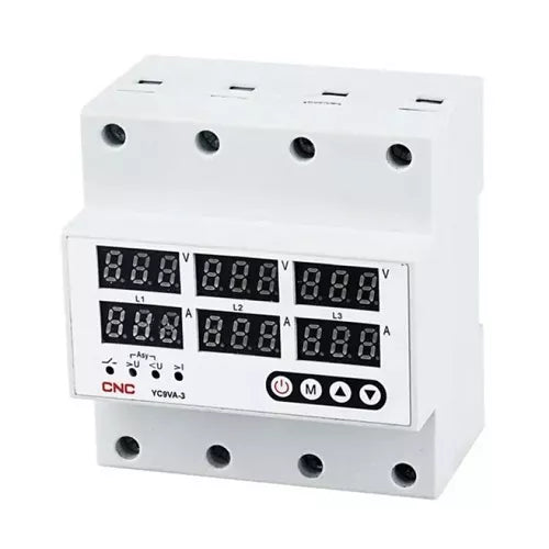 Ypatybės: Skaitmeninė įtampos ir srovės kontrolės relė naudojama trifazės elektros įrangos apsaugai nuo viršįtampių, žemų įtampų ar viršsrovių. Automatinė apsauga nuo viršįtampių ir žemos įtampos tinka trifazėms kintamosios srovės 380V grandinėms, kurių vardinė darbinė srovė ne didesnė kaip 63A. Tai mikroprocesoriumi pagrįstas vienfazės kintamosios srovės tinklų įtampos stebėjimo įtaisas, skirtas apsaugoti elektros įrangą nuo sugadinimo. Įrenginys analizuoja pagrindinę įtampą ir rodo įtampos ir srovės vertes skaitmeniniame indikatoriuje. Kai grandinėje atsiranda viršįtampių, žemų įtampų ar viršsrovių problemų, relė greitai ir patikimai atjungia grandinę, o kai grandinės įtampa grįžta į normalią būseną, automatiškai įjungia maitinimą. Mygtuku nustatoma pageidaujama įtampos vertė ir perjungimo uždelsimo laikas. Relės įjungimo uždelsimas apsaugo prijungtus prietaisus nuo pakartotinių įtampos svyravimų, kurie gali įvykti tinklui stabilizuojantis. Kompaktiška konstrukcija, patikimas veikimas, lengvas instaliavimas ant DIN bėgelio. Prijungimui galima naudoti aliumininius ir varinius laidus. Pritaikomas administraciniuose, pramoniniuose ir gyvenamuosiuose pastatuose; elektros skydeliuose ir pramoninėse mašinose, kur svarbu užtikrinti nuolatinį įtampos ir srovės stebėjimą. Pastaba: relė apsaugo nuo ilgalaikių tinklo įtampos svyravimų, tačiau nėra specialiai pritaikyta apsaugoti nuo žaibo sukeltų trumpų impulsinių viršįtampių. Tam skirti viršįtampių ribotuvai (SPD). Pagrindinės funkcijos: 1. Apsauga nuo viršįtampių. 2. Apsauga nuo žemos įtampos. 3. Apsauga nuo viršsrovių. 4. Automatinis atkūrimas. 5. Įtampos rodmuo (įtampos matavimas). 6. Srovės rodmuo (srovės matavimas).