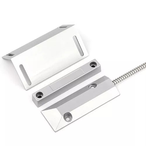 Ypatybės: Paviršinio montavimo magnetinis kontaktas su laikikliu skirtas apsaugos sistemoms, ypač garažo vartams ar pramoninėms durims. Kontaktas turi specialų tvirtinimo laikiklį, leidžiantį jį patogiai pritvirtinti net prie nelygaus ar metalinio paviršiaus. Jutiklis su laidu tvirtinamas ant fiksuotos konstrukcijos (pvz., durų rėmo ar sienos). Laidai apsaugoti nerūdijančio plieno vamzdžiu. Magnetas montuojamas ant judančios dalies. NC (Normally Closed) – tai kontaktas, kuris įprastai yra sujungtas (uždaras), kai magnetas arti. Nutolus magnetui, kontaktas atsijungia, ir apsaugos sistema sugeneruoja aliarmo signalą. Tinkamas naudojimui komerciniuose objektuose, garažo vartų, sandėlio durų ar pramoninių vartų apsaugai.