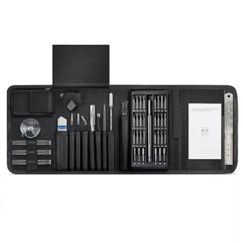 Rinkinį sudaro: antgaliai ir atsuktuvo rankena (magnetiniame dėkle), juodas nešiojamas medžiaginis įrankių dėklas, liniuotė, antistatinė apyrankė, 3x pincetai (smailas, bukas ir lenktas), 5x plastikiniai pleištai, metalinis pleištas, lankstus pleištas, ištraukiamas peiliukas, 8x plastikiniai trikampiai atidarytuvai (skirti atskirti prietaisų dalims jų nebraižant), lankstus atsuktuvo ilgintuvas, guminis siurbtukas su žiedu (ekrano nuėmimui), SIM dėklo adata ir magnetinis įrankių padėkliukas.