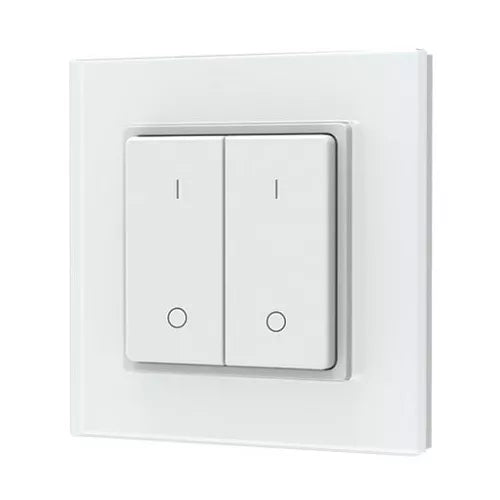 PF1-2(G) belaidis RF reguliatorius LED juostoms, vienai spalvai reguliuoti, 2.4GHz, 2 zonų, su 2 klavišais, 4 mygtukų valdymu, palaiko 256 apšvietimo lygių valdymą, su stiklo rėmeliu.