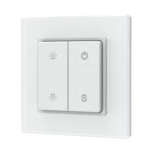 Ypatybės: Dviejų klavišų belaidis reguliatorius PF1(G) su stiklo rėmeliu yra skirtas vienos zonos, vienos spalvos LED apšvietimo valdiklių valdymui. Leidžia sklandžiai pritemdyti ar paryškinti apšvietimą. Suderinamas su dimeriuojamomis LED juostomis / lemputėmis. Įrenginys leidžia patogiai įjungti/išjungti šviesą. Trumpu paspaudimu klavišai leidžia reguliuoti apšvietimo ryškumą 10 lygių. Ilgas paspaudimas leidžia reguliuoti apšvietimo ryškumą 256 lygiais. Scenarijų mygtukas leidžia išsaugoti nustatymus (ilgu paspaudimu) arba panaudoti nustatytą ryškumą (trumpu paspaudimu). RF pultelio veikimo dažnis yra 2.4GHz, tai užtikrina stabilų signalą, jis mažiau trikdomas kliūčių, tokių kaip sienos, pertvaros ir pan. Patogus dizainas, su stiklo rėmeliu, reguliatorius gali būti išimamas iš rėmelio arba tvirtinamas prie sienos kaip jungiklis. Pultelis maitinamas viena CR2032 baterija. Budėjimo režimu baterija gali veikti iki 2 metų. Valdymo reguliatorius yra universalus, gali veikti su įvairiais LED valdikliais.