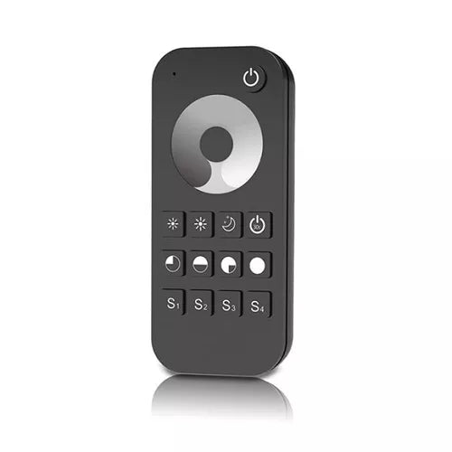 Nuotolinio valdymo RF pultelis LED juostų valdymui, vienos spalvos ryškumui nustatyti, 2.4GHz, 1 zonos, su sensoriniu ratuku, palaiko 4 scenarijų, 10 apšvietimo lygių valdymą.