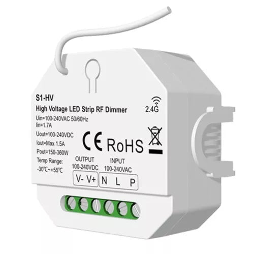 Ypatybės: Aukštos įtampos valdiklis yra tinkamas valdyti vienos spalvos LED juostai iki 25 metrų ilgio, maksimalia 360W galia. Jis skirtas reguliuoti šviesos intensyvumą. Prietaisas veikia su 100-240VAC įtampa ir gali reguliuoti iki 1.5A srovę. Valdiklis leidžia sklandžiai pritemdyti ar paryškinti apšvietimą iki 4096 lygių 0-100%. Suderinamas su dimeriuojamomis LED juostomis. Palaiko apšvietimo sistemas: vienos spalvos. Valdiklis leidžia nustatyti šviesos įjungimo/ išjungimo trukmę iki 3 sekundžių. Valdiklis yra suderinamas su RF 2.4 GHz vienos zonos arba kelių zonų šviesos reguliavimo nuotolinio valdymo pulteliais. Vienas RF valdiklis gali būti susietas su iki 10 nuotolinio valdymo pultelių. Jis turi automatinio perdavimo funkciją – signalas automatiškai perduodamas kitam valdikliui iki 30 metrų atstumu. Valdiklis taip pat palaiko sinchronizuotą veikimą su keliais kitais valdikliais. Turi derinimo mygtuką (MATCH) nuotolinių pultelių prijungimui. Valdiklis naudoja pažangiausią PWM (Pulse Width Modulation) skaitmeninio valdymo technologiją pastovios įtampos LED lempoms valdyti. Turi Push-dimm funkciją: prie valdiklio galėsite prijungti įprastą skambučio tipo (atšokstantį) jungiklį. Įrenginys mažas ir kompaktiškas, gali būti montuojamas tiesiai į standartinę sieninę montavimo dėžutę už įprasto jungiklio. Sertifikatai: CE, EMC, RED, RoHS.