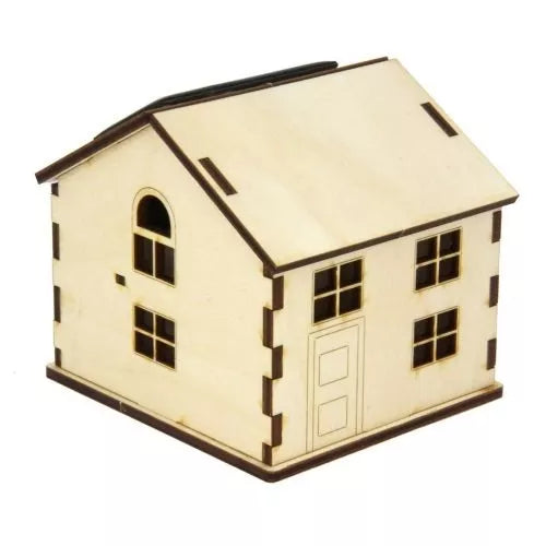Išimkite rinkinio dalis iš dėžutės ir atskirkite medines detales. Sekite iliustruotu vadovu, sujunkite pažymėtas sienas, sutvirtinkite klijais, o tada uždėkite ant pagrindo. Atidžiai įmontuokite baterijos blokelį, sujunkite laidus ir valdymo jungiklį. Laidai prie saulės skydelio jungiami pirštais prisukant varžtelius, nenaudokite atsuktuvo. Saulės skydelis tvirtinamas ant stogo. Ši stogo dalis įspraudžiama į angas, bet neklijuojama, kad akumuliatorių, esant poreikiui, galima būtų pakeisti.