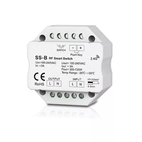 Ypatybės: Palaiko apšvietimo sistemas: vienos spalvos. Leidžia įjungti/išjungti apšvietimą. Suderinamas su vienos spalvos LED juostomis / lemputėmis, kaitrinėmis lempomis, halogeninėmis lempomis. Nepalaiko pritemdymo funkcijos. Maksimali apkrova 3A. Turi Push-Key jungtį: prie valdiklio galima prijungti įprastą skambučio tipo (atšokstantį) jungiklį. Veikimo dažnis yra 2.4GHz, tai užtikrina stabilų signalą iki 30m atstumu, jis mažiau trikdomas kliūčių, tokių kaip sienos, pertvaros ir pan. Turi derinimo mygtuką (MATCH) nuotolinių pultelių prijungimui. Minimalus dizainas. Tvirtinamas prie sienos po jungikliu, į standartinę elektros montavimo dėžutę. Valdiklis yra universalus, gali veikti su įvairiais RF pulteliais. Apsauga nuo perkrovos, perkaitimo ir nuo trumpojo jungimo. Sertifikatai: CE (EMC/LVD), RoHS.