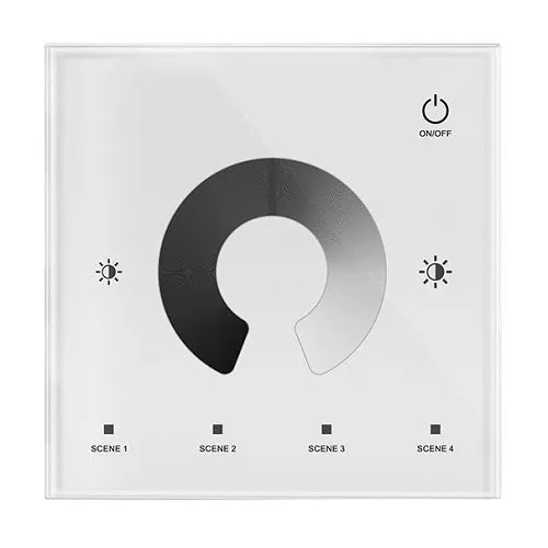 Ypatybės: Valdiklis palaiko vienos spalvos apšvietimo sistemas, skirtas valdyti iki 2 dimeriuojamų LED juostų. Leidžia sklandžiai pritemdyti ar paryškinti apšvietimą. Švelnus šviesos dimeriavimas, įjungimas ir išjungimas be jokių mirgėjimų. Galima valdyti LED juostas tiesiai iš valdiklio, be papildomų imtuvų. Atskiras patogus įjungimo/ išjungimo mygtukas. Išsaugomi 4 skirtingi apšvietimų nustatymai (scenarijai), aktyvinami jutikliniais mygtukais. Tai leidžia pasirinkti norimą apšvietimą pagal nuotaiką vienu paspaudimu. Jutiklinis ratukas leidžia patogiai reguliuoti apšvietimo ryškumą 10 lygių. Atskiri jutikliniai mygtukai skirti šviesos ryškumo sumažinimui arba padidinimui 10 lygių tarpsniais. Jutiklinė panelė lengvai randama tamsoje dėl foninio apšvietimo. Valdiklis naudoja PWM išėjimą, kad reguliuotų LED ryškumą, perjungdamas srovės impulsus. Palaiko RF 2.4GHz vienos ar kelių zonų nuotolinį valdymą. Prabangus dizainas, stiklinė panelė. Tvirtinamas prie sienos kaip jungiklis. Valdymo reguliatorius yra universalus, gali veikti su įvairiais LED valdikliais bei suderinamas su nuotolinio valdymo pulteliais. Valdiklis aprūpintas apsauga nuo perkaitimo, atvirkštinio poliariškumo bei trumpojo jungimo.