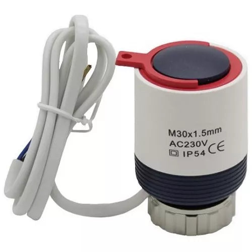 Techniniai duomenys: Paskirtis: vandens šildymo sistema. Terminės pavaros veikimo tipas: NC (normaliai uždara). Darbinė įtampa: AC 230V, 50/60Hz. Pradinė srovė: 50mA. Suveikimo laikas: iki 180s (vožtuvo išjungimas-įjungimas). Energijos sąnaudos: 2W. Galia: 100N (± 10%). Instaliavimas: jungiama prie kolektoriaus. Sriegis: M30x1.5mm. Kabelio ilgis: 80cm. Darbinė temperatūra: -20°C~ +50°C. Darbinė drėgmė: 5%~95%RH (nekondensuoja). Saugos klasė: IP54. Išmatavimai: 40 x 40 x 68 mm. Spalva: balta. Sertifikatai: CE EN60730.