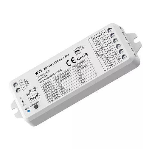 Ypatybės: Palaiko apšvietimo sistemas: vienos spalvos, dviejų spalvų, spalvotas RGB, RGBW (spalvota RGB+balta W), keičiamo atspalvio CCT. Leidžia sklandžiai pritemdyti ar paryškinti apšvietimą iki 4096 lygių 0-100%. Suderinamas su dimeriuojamomis LED juostomis / lemputėmis. Leidžia valdyti spalvos temperatūrą (šilta/ neutrali/ šalta balta šviesa). Galima valdyti išmaniąja programėle „Tuya APP“ ar „Smartlife”. Palaiko laikmačio ir tvarkaraščio funkcijas. Palaiko scenarijus ir muzikos grotuvus per programėlę. Palaiko valdymą balsu: Amazon Alexa, Google Home ir pan., bei Amazon Echo, Xiaodu, TmallGenie išmanius garsiakalbius. Palaiko dinaminį RGB spalvų valdymą. Leidžia pasirinkti šviesos įjungimo/ pritemdymo trukmę. Vienalaikis automatinis perdavimas: automatiškai perduoda signalą kitam valdikliui 30 m atstumu, sinchronizuoja veiklą su kitais valdikliais (rekomenduojama neviršyti 25 valdiklių skaičiaus). Turi derinimo mygtuką (MATCH) nuotolinių pultelių prijungimui. Galima valdyti 2.4 GHz RF nuotolinio valdymo pulteliais, belaidžiais sieniniais jungikliais, sensoriniais jungikliais. Valdiklis taip pat gali veikti kaip Wi-Fi – RF keitiklis, tada naudokite Tuya programą, kad sinchroniškai valdytumėte vieną ar kelis RF LED valdiklius arba RF LED pritemdymo reguliatorius. Valdiklis naudoja pažangiausią PWM (Pulse Width Modulation) skaitmeninio valdymo technologiją pastovios įtampos LED lempoms valdyti. Apsauga nuo perkrovos, perkaitimo, atvirkščio poliariškumo ir nuo trumpojo jungimo. Sertifikatai: CE (EMC/LVD), RoHS.